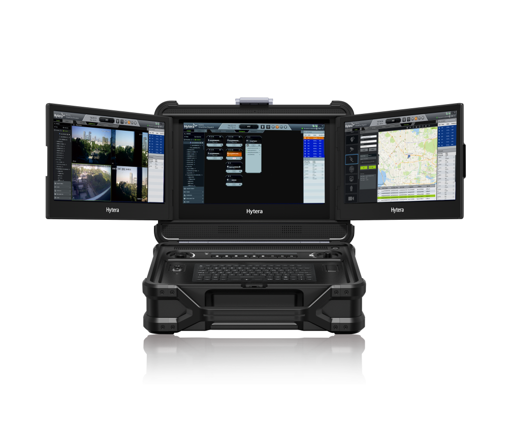 海能达指挥调度解决方案可在后方指挥调度大屏将各类指挥资源和警务态势“一张图”整体呈现,在“屏”侧,海能达还可提供自主研发的便携式现场指挥调度中心设备(E-center),可便捷实现现场指挥调度,无需进行复杂的组装部署及供电系统等基建支持,架设快、开机快、收装快、转移快;采用三屏设计,可选择显示地图、视频和调度界面,更全面、清晰、直观地掌握现场情况,及时地对工作人员进行指挥调度;E-center提供多种链路接入方式,便于现场组网设备与指挥中心相连,并且可与后方指挥中心互联,实现联动指挥。例如,海能达E-Center上承载宽带集群对讲服务端软件P-POC6000,以及应急指挥(PUC)的服务端与客户端软件,实现临时的应急指挥中心,并通过自身的路由交换功能实现与现场通信管道的互通,以及与后方指挥中心总部的通联。