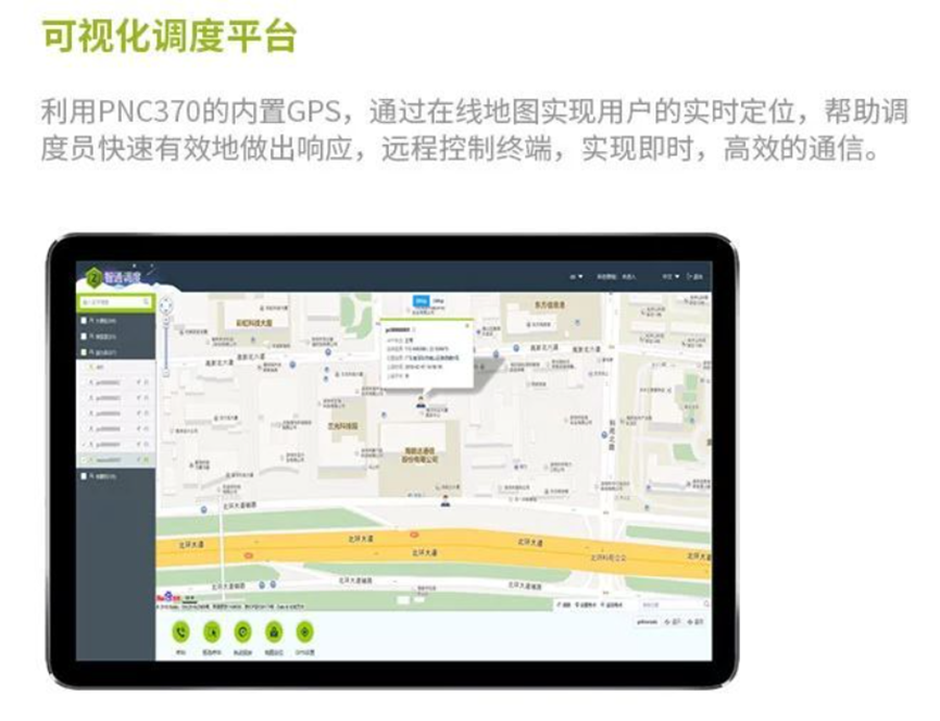 基于网页版的调度平台,能实现实时单呼、组呼、临时组呼、多媒体(文字、图片、语音)图传、实时视频通话,还可配合百度、谷歌地图实现用户GPS实时定位、轨迹回放、框选呼叫。同时可通过遥